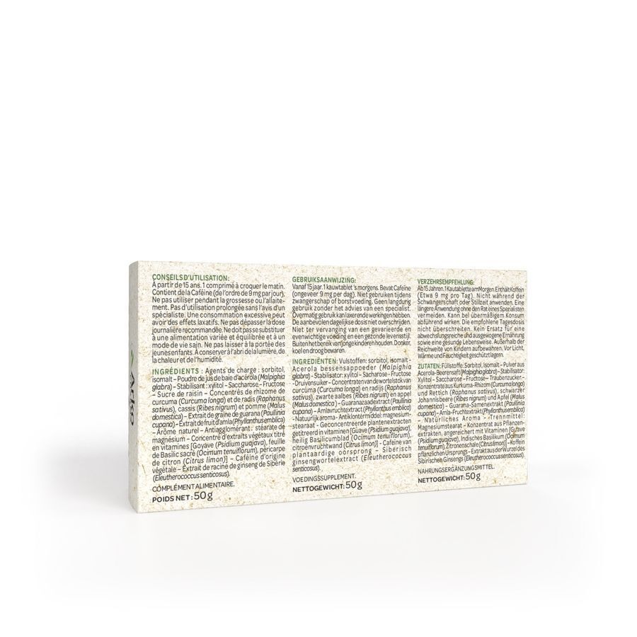 Charges : sorbitol, isomalt - Poudre de jus de baies d'Acérola (Malpighia glabra L.) - Stabilisant : xylitol - Saccharose - Fructose - Sucre de raisin - Concentrés de rhizome de Curcuma (Curcuma longa L.) et de Radis (Raphanus sativus L.), de Cassis (Ribes nigrum L.) et de Pomme (Malus domestica Borkh.) - Extrait de graine de Guarana (Paullinia cupana Kunth.) - Extrait de fruit d'Amla (Phyllanthus emblica L.) - Arôme naturel - Anti-agglomérant : stéarate de magnésium - Concentré d'extraits végétaux, titré en vitamines [Goyave (Psidium guajava L.), feuille de Basilic sacré (Ocimum tenuiflorum L.), paroi de la graine de Citron (Citrus limon (L.) Burm. f.)]. - Caféine végétale - Extrait de la racine de ginseng sibérien (Eleutherococcus senticosus (Rupr. ex Maxim.) Maxim.).