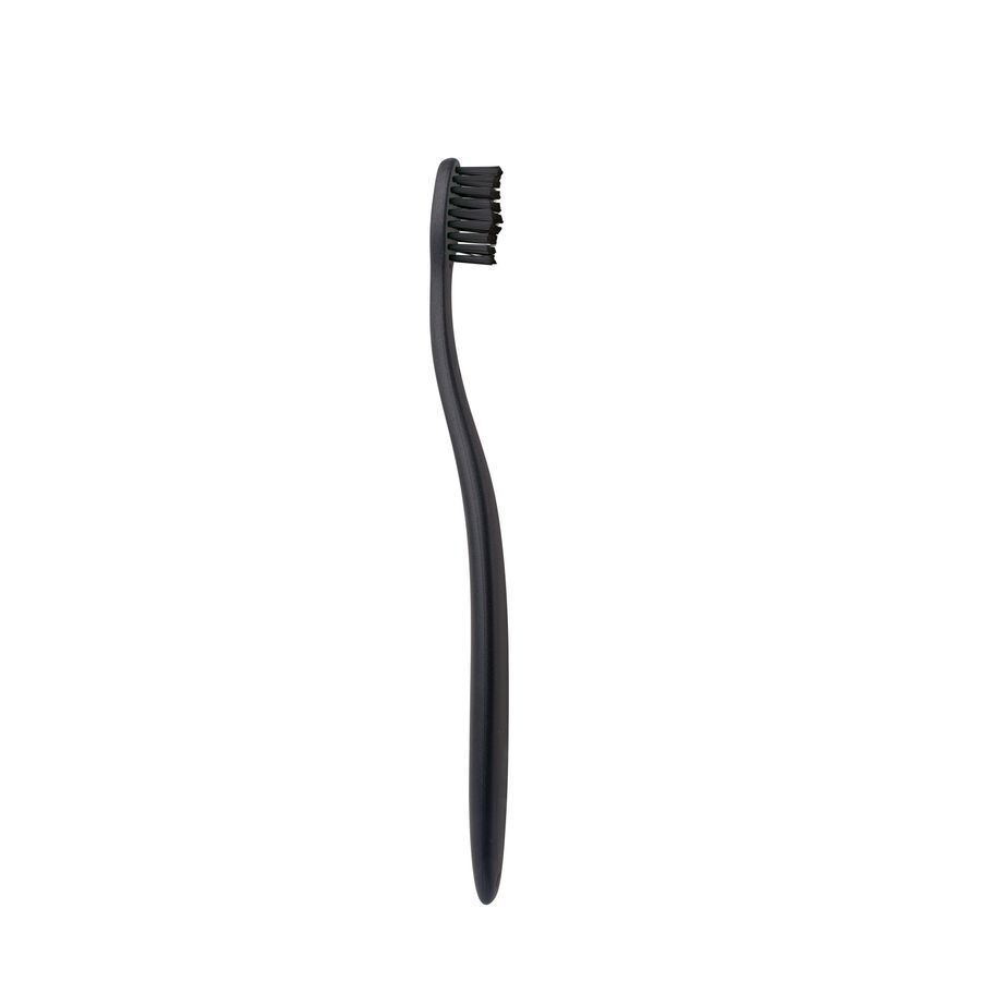Une brosse à dents fabriquée en plastique 100 % recyclé avec des poils d'origine végétale.