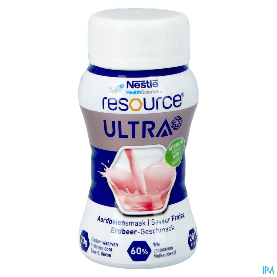 Resource Ultra+ est un aliment riche en protéines et en énergie. Une bouteille de 125 ml contient 20 g de protéines de lactosérum (28 % de kcal) et 281 kcal (2,25 kcal/ml). Nutrition à usage médical en cas de malnutrition ou de risque de malnutrition chez l'adulte.