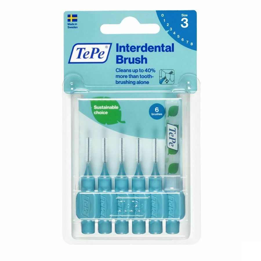 Une brosse interdentaire de TePe, conçue pour nettoyer les espaces entre les dents qu'une brosse à dents ordinaire ne peut atteindre. A utiliser quotidiennement pour garder les gencives, les dents et les molaires saines et fraîches.