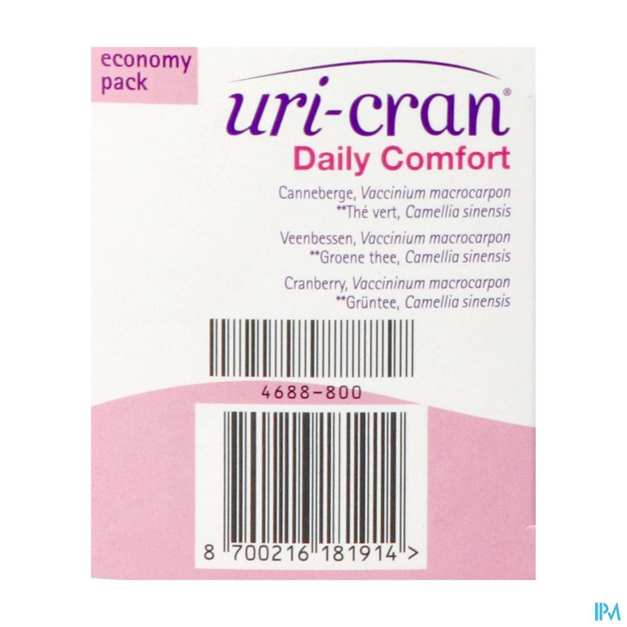 Uri-Cran Daily Comfort est un complément alimentaire à base d'extraits de canneberge et de thé vert pour soutenir les fonctions des voies urinaires, des reins et de la vessie. L'extrait de canneberge aide à empêcher les bactéries d'adhérer aux parois des voies urinaires, réduisant ainsi le risque d'infections urinaires. L'extrait de thé vert peut favoriser la production d'urine et le rinçage des voies urinaires.
