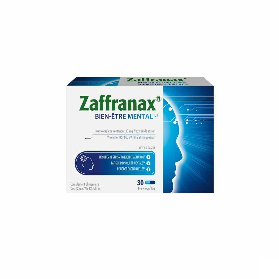 ¹ Zaffranax® contient du safran qui soutient l'équilibre émotionnel, aide à se détendre et à conserver un état d'esprit positif. Il contient du magnésium qui contribue au maintien d'un esprit serein et qui aide à réduire la fatigue, de la vitamine B5 qui contribue à des performances mentales normales, y compris la résistance au stress et la concentration ainsi que des vitamines B6, B9, B12 qui aident à réduire la fatigue.